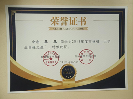 在她十岁时,失去了自己的父母,此后一直就读于辽宁省孤儿学校,即使有这般不公平的命运,但她仍然自强不息,积极进取,为梦想而拼搏。非常荣幸,在2020年8月,她获得了吉林省2019年度“自立自强大学生”,这份荣誉对她来说是一份认可,更是一份激励。天行健;君子以自强不息,地势坤,君子以厚德载物。