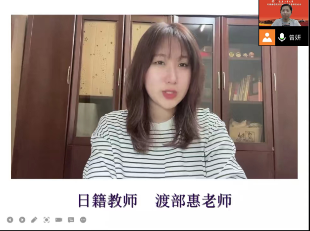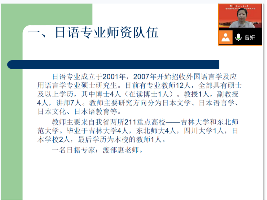 日语系主任曾妍从校园环境、专业特色、人才培养目标、毕业去向等方面,希望新生能够学会自主、选择、独立、规划,积极参加社会实践,省级、全国各类日语比赛。曾妍老师也讲了长春疫情的形势,同学们要延期到校,希望同学们在家上好网课,期待早日课堂上相见。外籍教师渡部惠通过视频向同学们送来祝福,欢迎大家来到工大日语专业学习,祝愿同学们能拥有美好快乐的四年大学生活!
