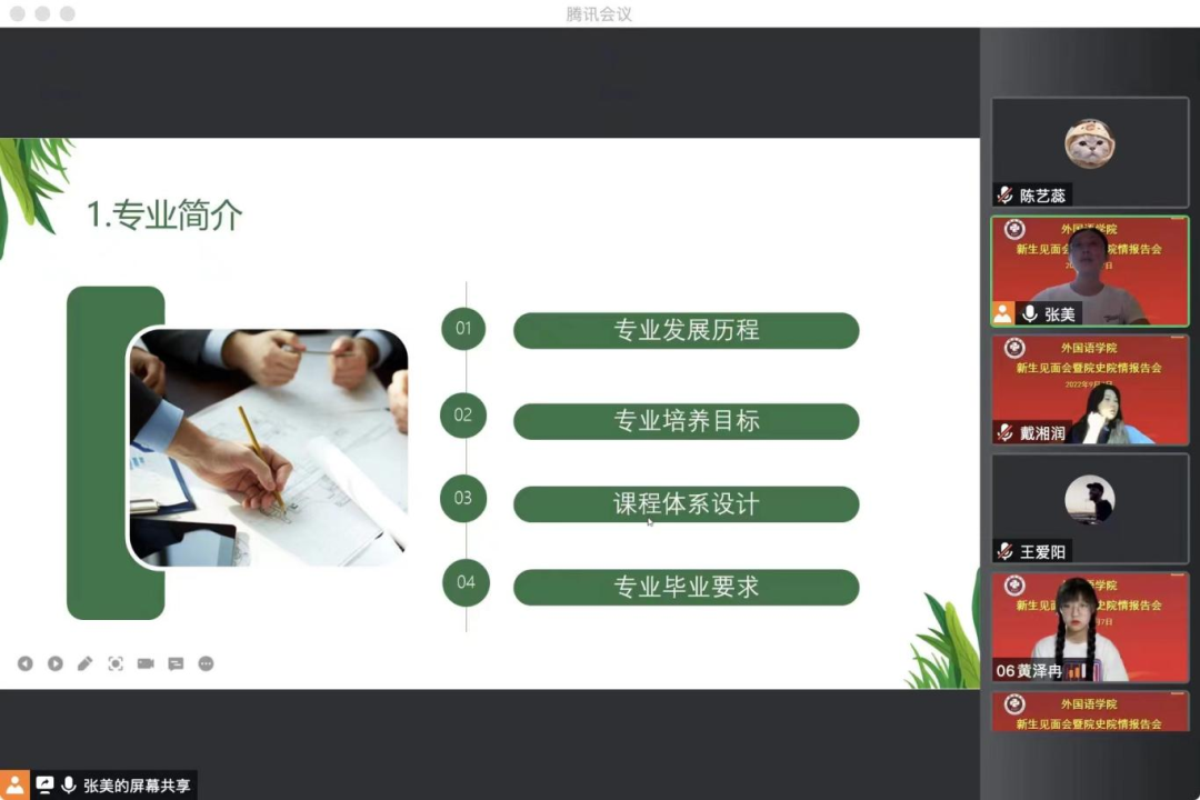 本网讯(通讯员 李梓溪)新学期有新起点,新学期有新希望。为了使同学们深入了解本院以及本院所设专业的特色和优势,帮助同学们找准定位,合理规划专业学习方向和目标。bat365在线中国官网登录入口于9月7日下午通过腾讯会议举行了英日俄专业介绍会,各系主任和2022级全体新生参加此次会议。