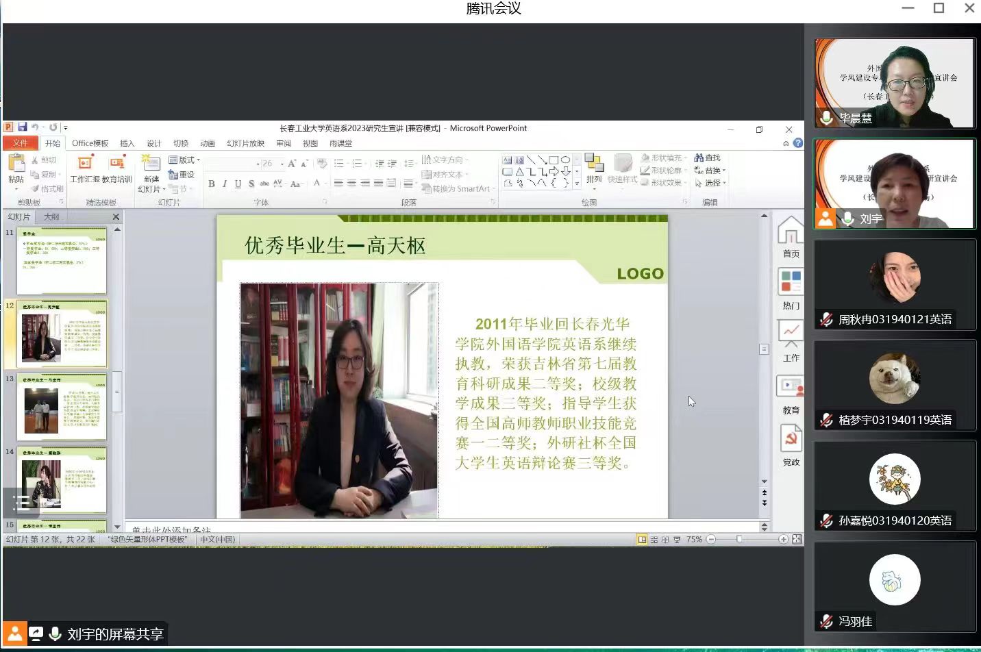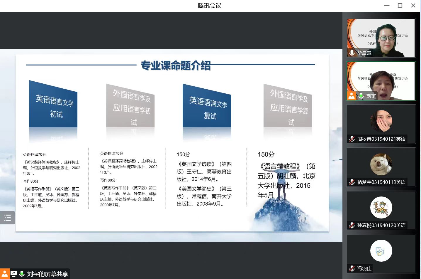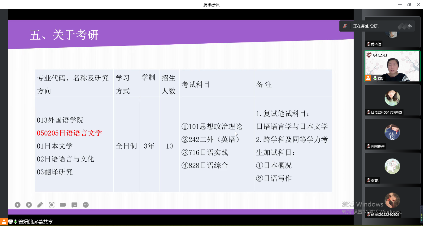 在日语专业组,崔伟老师主持会议。曾妍首先从bat365在线中国官网登录入口的发展历史、师资力量、丰富的学术及社会实践活动、研究生奖助体系等方面介绍了bat365在线中国官网登录入口外国语言文学一级学科硕士点的概况,然后对日语语言文学方向进行了详细地介绍,分别从师资力量、课程设置、学科优势、学生就业和关于考研五个方面进行讲解,并指出考研是学术和人生方面一次重要的提升机会,希望同学们结合自身实际情况确定适合的考研目标,坚定信念,实现考研梦!最后,崔伟老师对曾妍老师的细致讲解表示衷心的感谢。