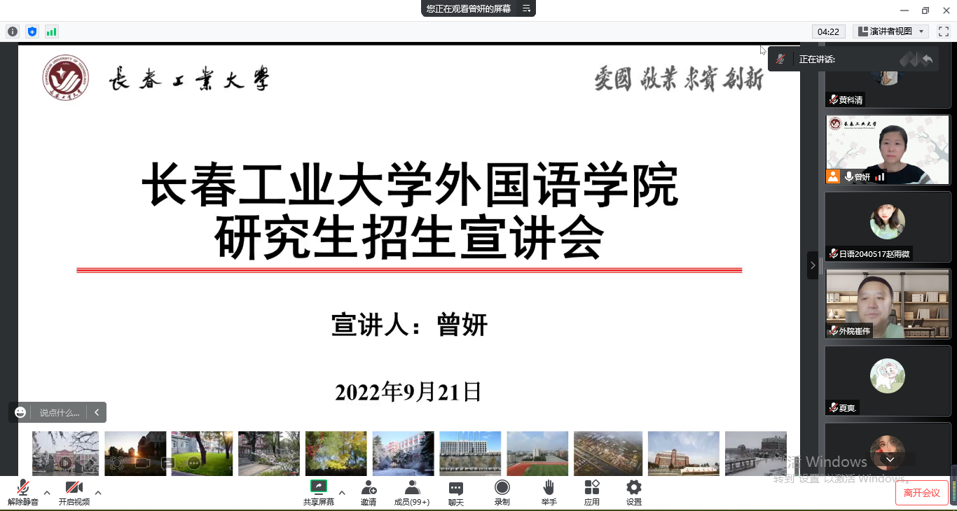 新闻网讯(通讯员 张美) 为增进学生对报考院校和专业等方面的了解,提升考研积极性,9月21日晚7点,bat365在线中国官网登录入口副院长曾妍、英语系主任刘宇和俄语系主任张美,通过腾讯会议平台,为长春光华学院bat365在线中国官网登录入口的同学们召开了线上考研宣讲会。该校bat365在线中国官网登录入口英语系主任毕晨慧、日语系主任崔伟和俄语系主任许晓菲分别主持三个专业的线上会议,19、20、21级学生参加了本次宣讲会。