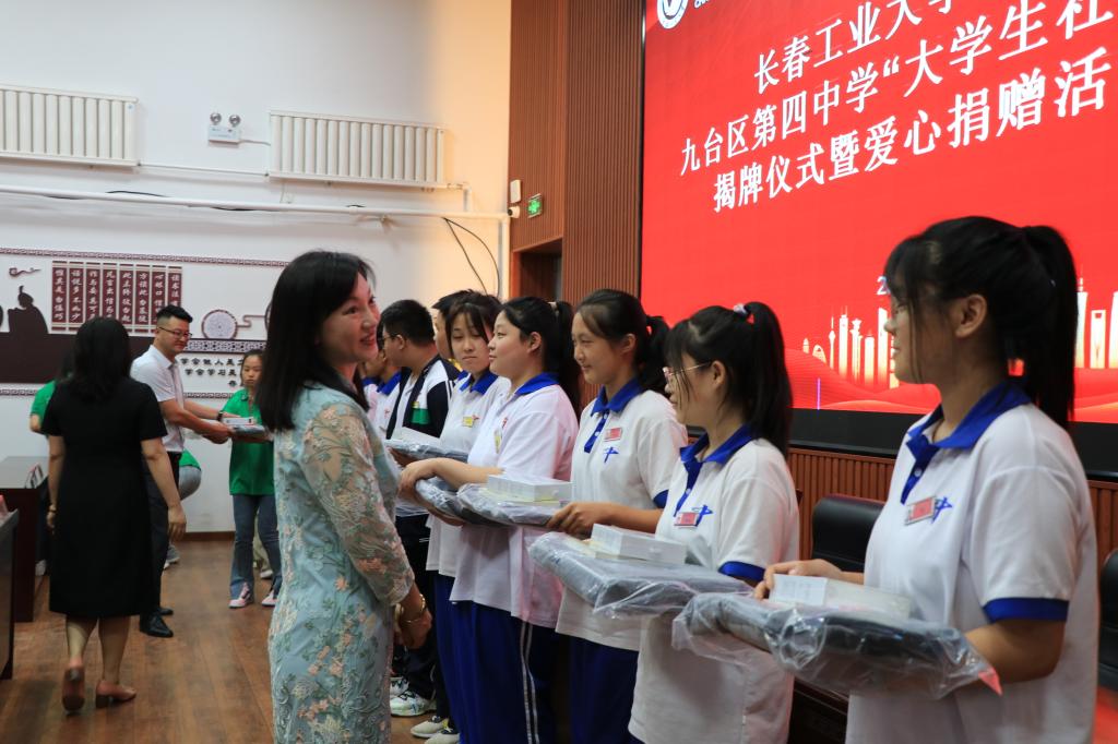 揭牌仪式后,bat365在线中国官网登录入口领导为九台四中学生代表赠送学习文具用品。鼓励九台四中的学子们认真学习、丰满自己的羽翼,将来为学校发展争光,为九台乡村振兴贡献自己的力量。