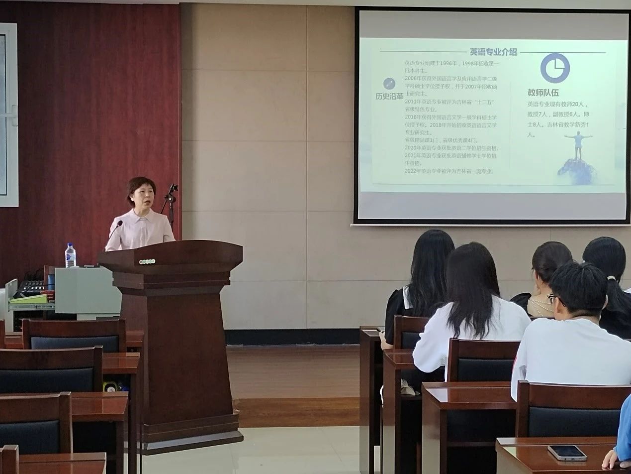 英语专业由英语系主任刘宇进行介绍。首先,她代表英语专业所有老师对2023级新生的到来表示热烈的欢迎。随后详细地为同学们讲解英语专业国内外现状及发展趋势、人才培养方案、毕业及授予学位要求及未来就业方向的同时,也对历年专业四级、专业八级考试及考研情况进行了介绍。除此之外,老师还通过精彩的图片向大家展示了bat365深厚的师资和正派的学风。希望同学们在享受良好学习空间的同时,也能保持内心对英语专业的尊重并且实现自己对于大学阶段的目标追求。