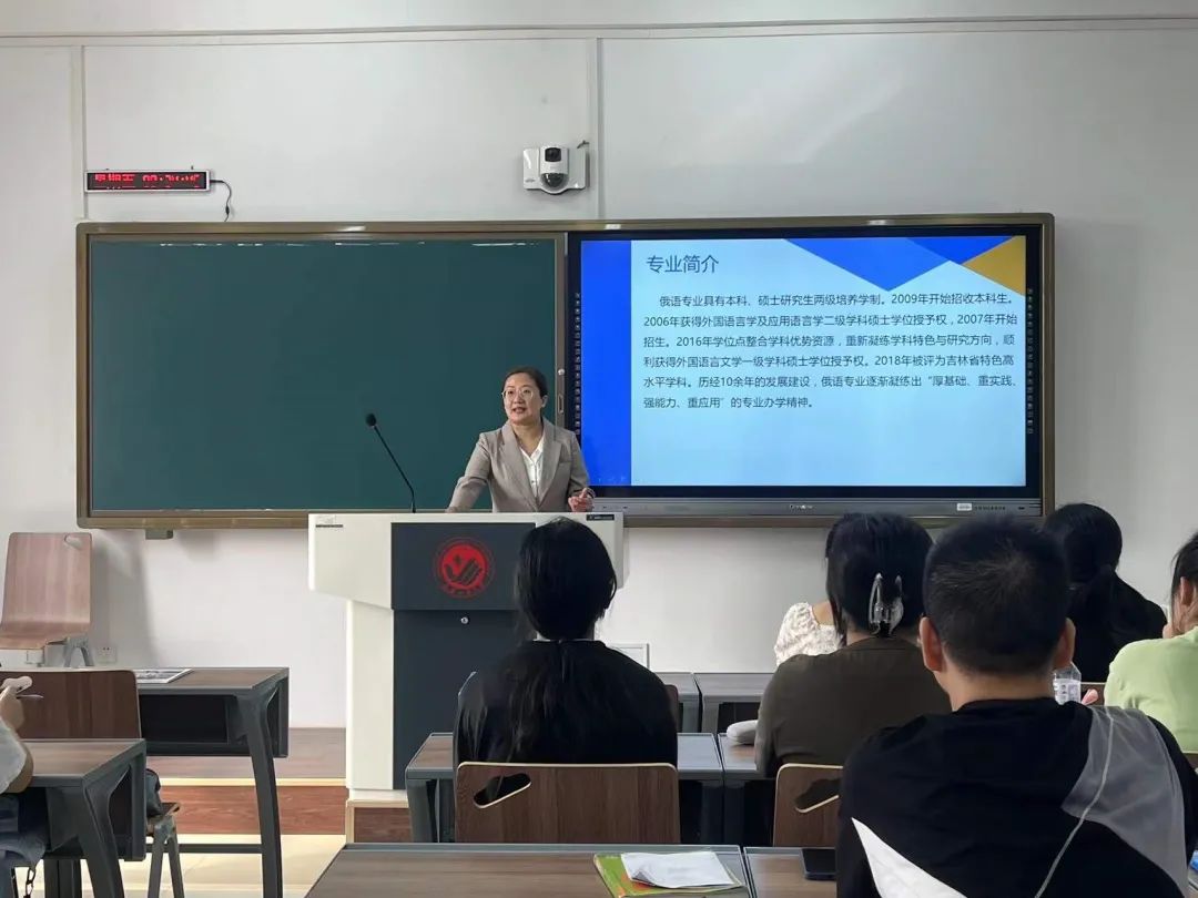 俄语专业由俄语系教师张微进行介绍,她从基本情况、师资队伍、人才培养目标三个维度做出了详细的解读。并指出,本专业培养政治素质高,业务能力强、具有扎实的俄语语言基础和广泛的科学文化素养,精通俄语,通晓英语,兼备国际金融与外贸知识,能熟练从事外事、经贸、旅游、翻译、教育等工作的高级俄语应用型人才。希望同学们能明确目标、脚踏实地、学有所成、学有所获。