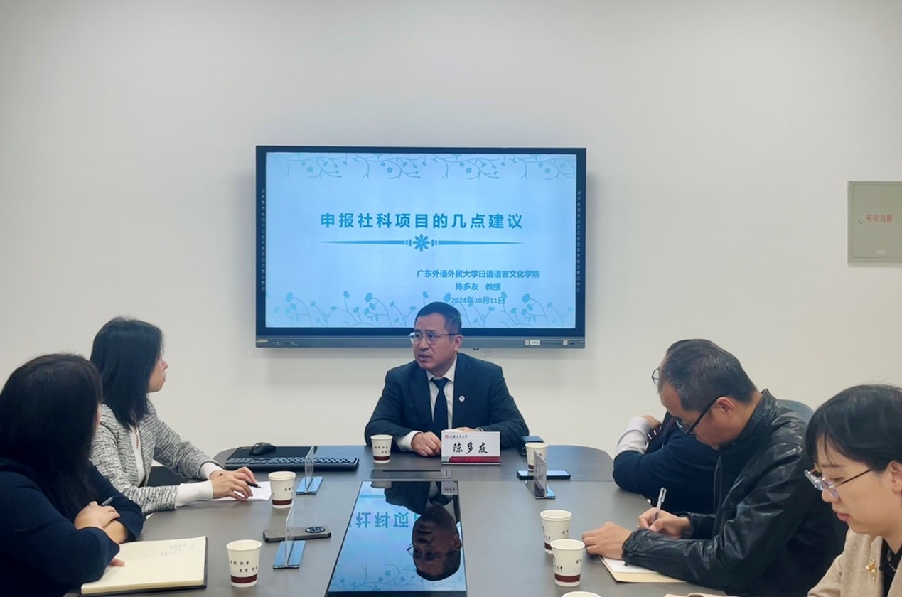 本网讯(通讯员 贾鹤)为提升bat365在线中国官网登录入口青年教师的科研能力和社科项目申报质量,10月11日上午,学院特邀广东外语外贸大学博士生导师陈多友教授为学院青年教师作了题为“申报社科项目的几点建议”的学术讲座,bat365在线中国官网登录入口副院长李秀文、曾妍、日语系主任及学院部分青年教师参加了此次学术讲座。
