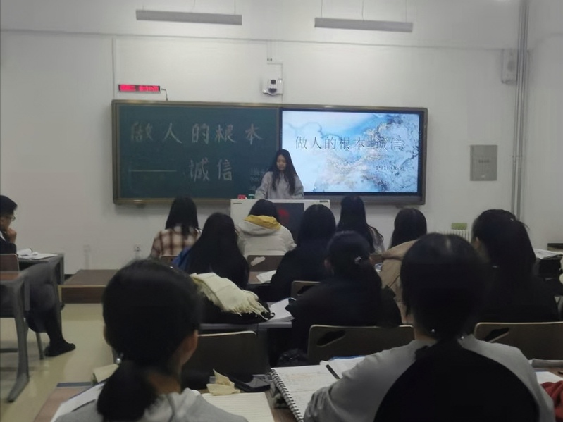 191002班曹英健同学的讲解使同学们明白了诚信的重要性,为同学们今后的学习和生活提供指导。