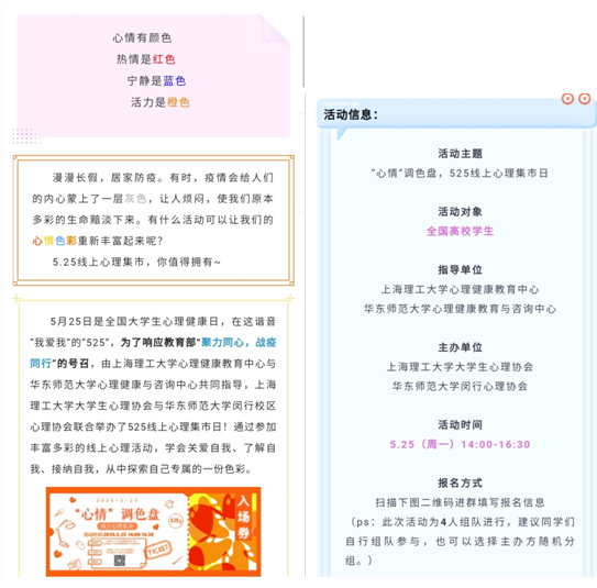 新闻网讯(通讯员 于士纪)2020年5月25日,bat365在线中国官网登录入口“学姐制”朋辈心理辅导站组织同学们参与了由上海理工大学大学生心理协会和华东师范大学闵行心理协会主办的“心情”调色盘,525线上心理集市日活动。