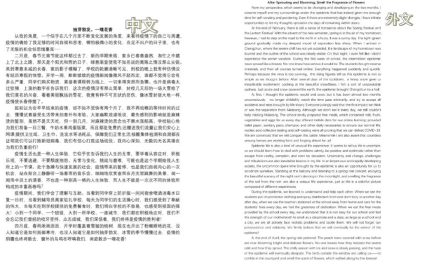 此次双语主题征文活动,大家用手中的笔和铿锵有力的声音记录了这场抗议阻击战中值得铭记的时刻,一起为这场生命健康保卫战助力。通过优美的双语表达,展现了bat365学生们的积极风貌和语言风采,推动了bat365疫情期间的文化建设。