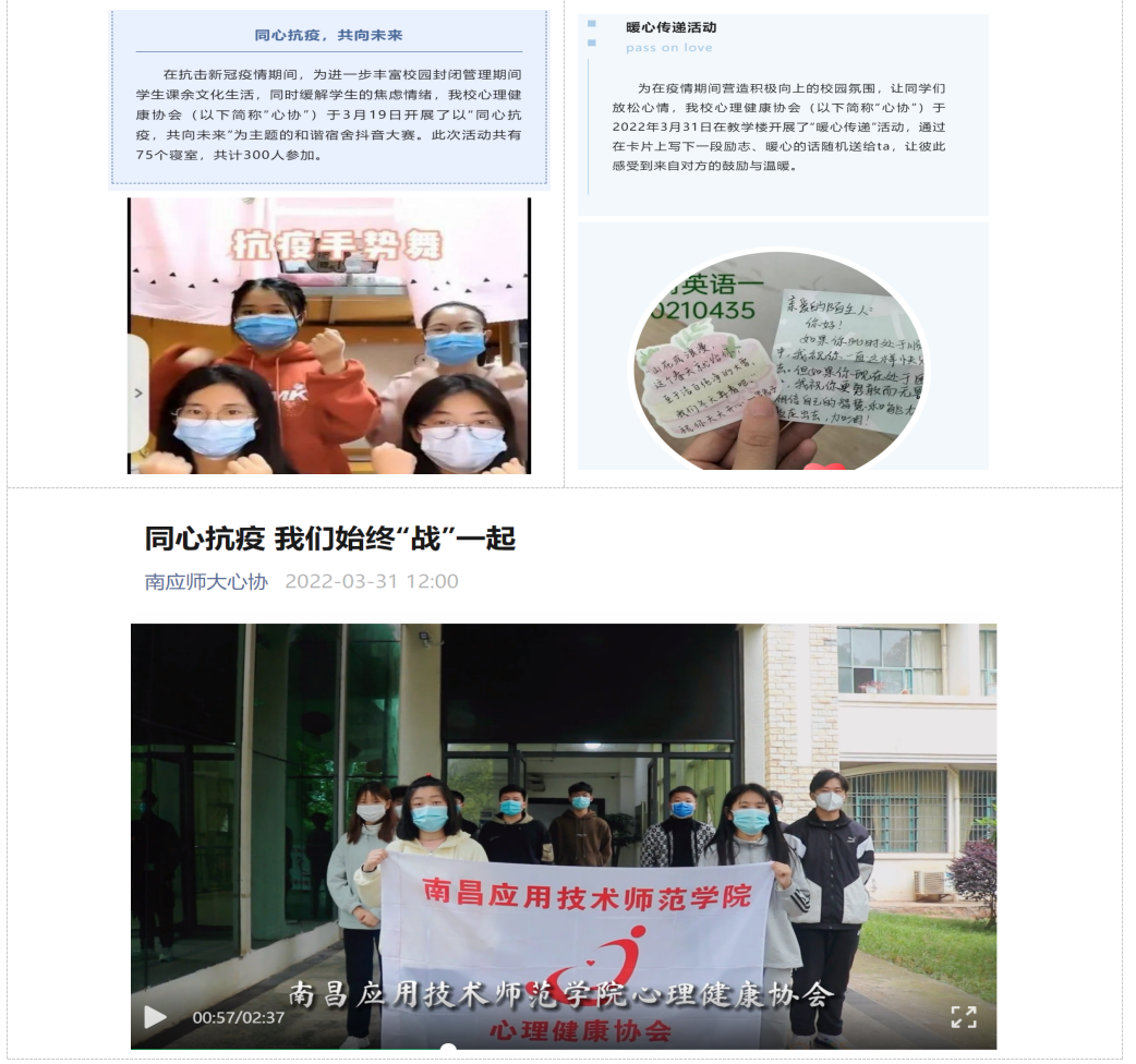 南昌应用技术师范学院分层次多角度全方位地为学生提供心理健康服务。学校将继续关注广大学生的心理动态,宣传与抗击疫情相关的心理健康知识和调适方法,主动介入心理辅导与危机干预,帮助全体学生在疫情中提高心理免疫力,增强心理韧性,并将战胜疫情的坚定信念传递给每一位同学,共同打赢这场疫情防控阻击战!