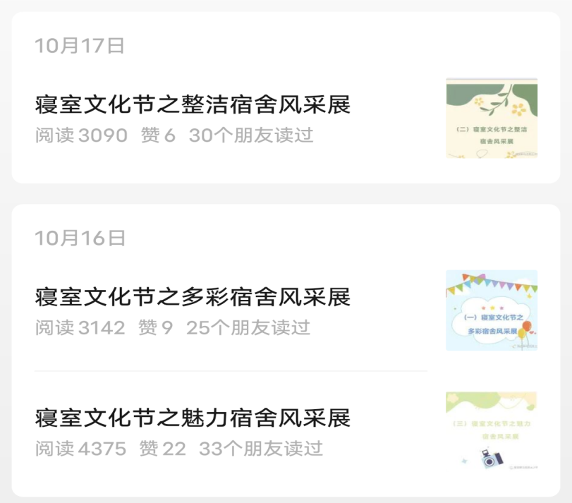 此次活动初选与网络投票环节,共开设三个主题赛道:“多彩宿舍”、“整洁宿舍”、“魅力宿舍”。寝室成员在合作中设计寝室,用镜头记录真实生活,定格美好的寝室瞬间。同学们自由选择主题,在规定时间内积极的上传寝室作品。经活动工作人员的认真筛选后,以“多彩宿舍”为主题的8组作品、以“整洁宿舍”为主题的16组作品、以“魅力宿舍”为主题的7组作品成功进入网络投票环节。