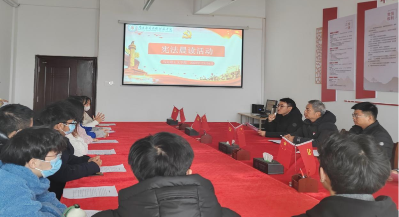 为进一步提高全体师生法律意识,引导学生深入了解宪法、尊崇宪法精神,增强法治观念,推动校园法治文化建设,beat365中文唯一官网于2023年12月4日上午9:30在1511会议室组织开展了“宪法晨读”活动,活动由法学教研室主任李水根主持,院长文道贵、党总支书记张欣康、党总支副书记李婷、副院长张丹、法学教研室部分专任老师以及法学班20名学生参加。