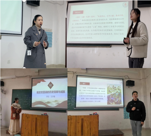此次授课内容为第六专题“中国特色社会主义进入新时代之脱贫攻坚”,授课主要围绕中国特色社会主义进入新时代的脱贫攻坚这一焦点展开,石仁凤老师主要讲授了中国特色社会主义进入新时代的背景知识,学生吴芳琴、王宇璐和查明华重点分析脱贫攻坚的理论基础、历史进程与成就,总结脱贫攻坚工作的启示和意义。师生同堂,互动热烈。