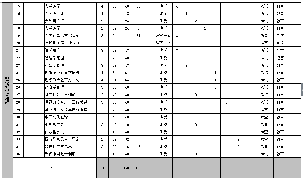 学位课程:大学英语、计算机应用基础、法学概论、马克思主义基本原理、毛泽东思想和中国特色社会主义理论体系概论、科学社会主义理论、世界政治经济与国际关系、马克思主义经典著作选读、社会学原理、管理学原理、思想政治教育学原理、政治学原理、西方经济学、中国哲学史、学与教的心理学、教育基本原理与方法、中学政治课教学论