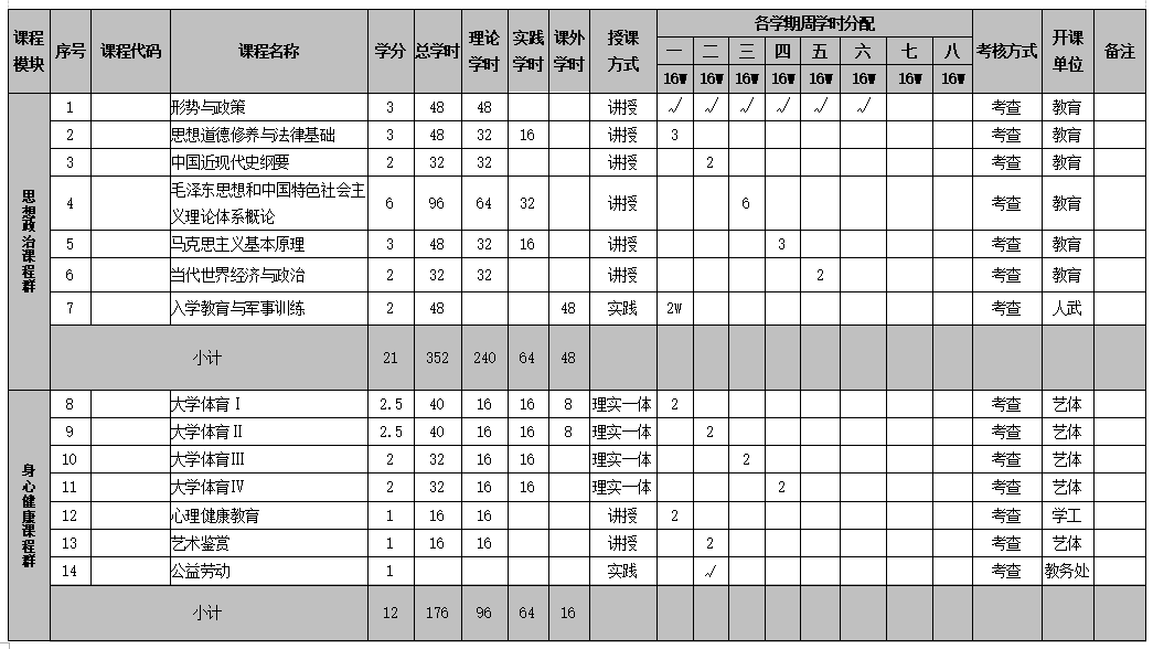 新生入学后进行2周军事理论教育和训练,合格者记1学分。
