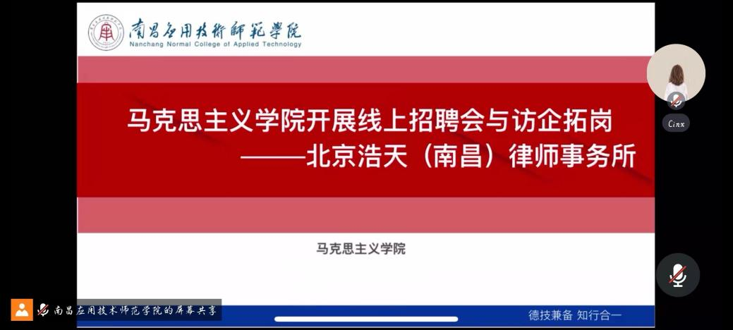 为了畅通毕业生与用人单位之间的沟通渠道,助力毕业生实现高质量就业,beat365中文唯一官网于2024年6月26日举办了一场线上招聘会,邀请了北京浩天(南昌)律师事务所、南昌正维空间设计有限公司参加此次招聘会。此次招聘会旨在为学生提供更多的就业机会,同时帮助企业发掘优秀人才,促进双方的共赢发展。beat365中文唯一官网党总支书记张欣康、就业专员朱文清、毕业班辅导员和部分毕业生参加了会议。