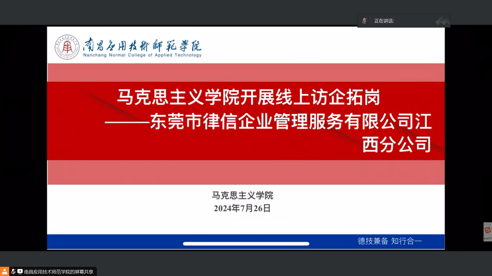 为进一步拓宽毕业生就业渠道,加强校企合作,促进学生高质量就业,beat365中文唯一官网于2024年7月26日通过视频会议的方式与东莞市律信企业管理服务有限公司江西分公司开展了线上访企拓岗活动。