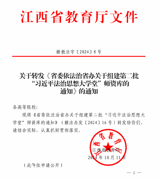 近日,江西省教育厅下发了《关于转发《省委依法治省办关于组建第二批“习近平法治思想大学堂”师资库的通知》(赣教法字〔2024〕8号)》的通知文件,确定了70位讲师入选全省第二批“习近平法治思想大学堂”师资库。beat365副教授刘德彰成功入选。