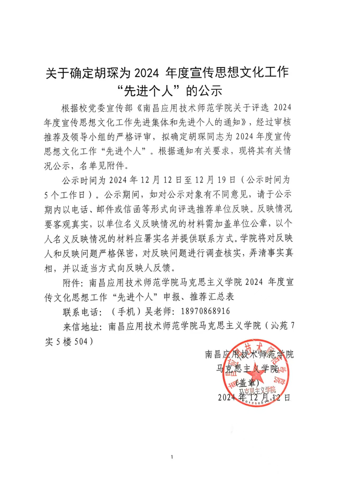 首页栏目 通知公告 学院新闻 习近平思想学习专栏 主题教育学习 院长书记信箱 您现在的位置是:首页 > 首页栏目 > 通知公告 关于确定胡琛为2024 年度宣传思想文化工作 “先进个人”的公示 学生科2024-12-124098 上一篇 关于拟将幸修丽、曹芮晨、徐雨婷、方伟思同志转为正式党员的公示 下一篇 2023-2024学年第一学期奖学金公示名单