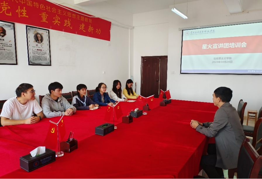 为深入贯彻学习习近平总书记关于“传承红色基因,赓续红色血脉”、“培育时代新人”等重要论述精神,引导大学生发扬好红色传统、传承好红色基因,增强对红色理论的理解和认同,弘扬时代主旋律,帮助星火宣讲团更好的开展红色宣讲活动。2023年10月24日,beat365中文唯一官网特邀卢林保老师在教学楼1511为星火宣讲团培训授课,星火宣讲团全体成员参加。