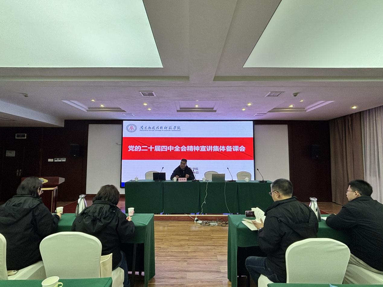 毛泽东思想与中国特色社会主义理论体系概论教研室赵长胜教授对党的二十届四中全会精神进行了系统解读和深入阐释,主要从会议概况、重大意义、核心要义等方面入手,结合国内外形势和学院实际情况,对全会提出的新理念、新论断、新任务进行了详细讲解。宣讲团成员认真聆听、仔细记录,就一些重点难点问题进行了深入探讨。