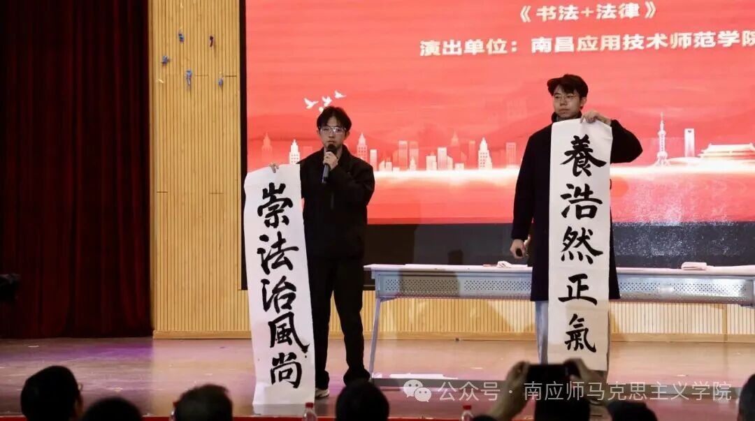 本次活动由共青团九江市委员会、九江市司法局等多部门指导,九江市青少年宫联合九江高校青少年法治育人联盟(筹)等单位共同主办,紧扣“弘扬宪法精神,建设法治文化”主题,旨在落实《青少年法治教育大纲》,构建校地协同的法治教育新格局。南昌应用技术师范学院作为联合主办单位之一,由beat365法学社与兰亭书法协会组建专项队伍参与,在法学社指导老师李水根带领下,以“书法+法律”特色展演、集体宣誓、户外普法等多元形式深度参与,用青春力量奏响法治宣传强音。